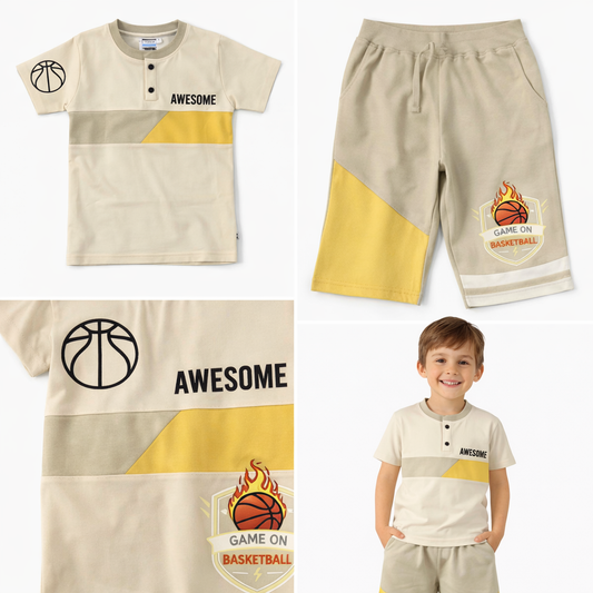 Boys Cotton Co-Ord Set (Beige “Awesome” T-Shirt & Bermuda | Basketball Theme)