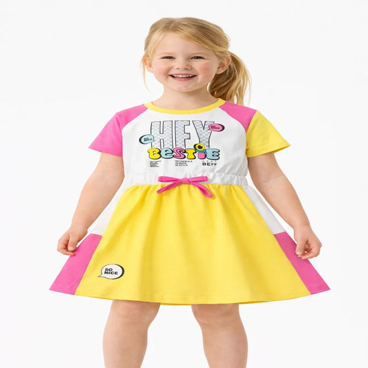 Girls A-Line Cotton Frock (Yellow & Pink Color Block | Hey Bestie Print Dress)