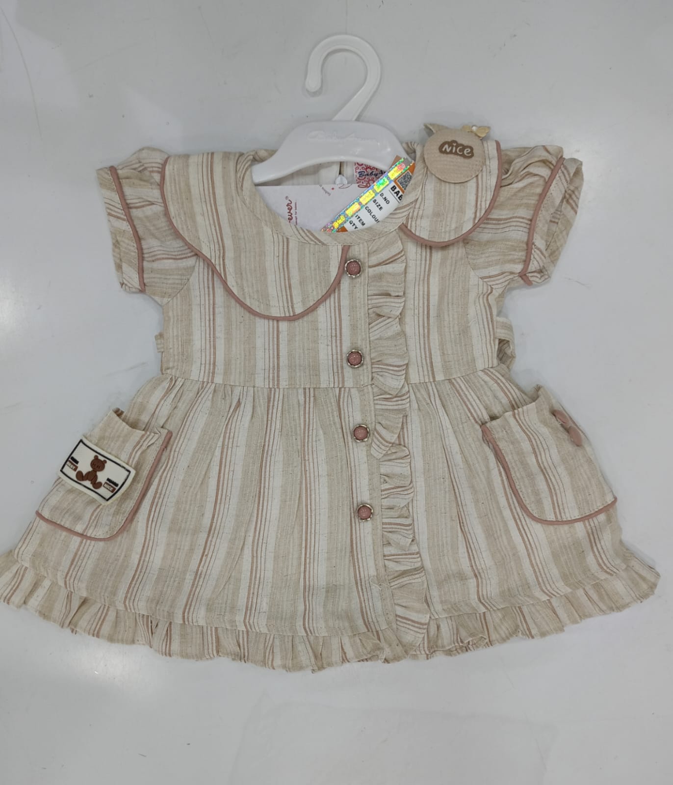 Soft, sweet, and picture-perfect! This beige striped frock features a rounded collar, cute embroidered pocket patches, wooden-style buttons, and a charming ruffled hem. Made from breathable cotton for ultimate comfort — ideal for everyday wear or casual outings with your little star.