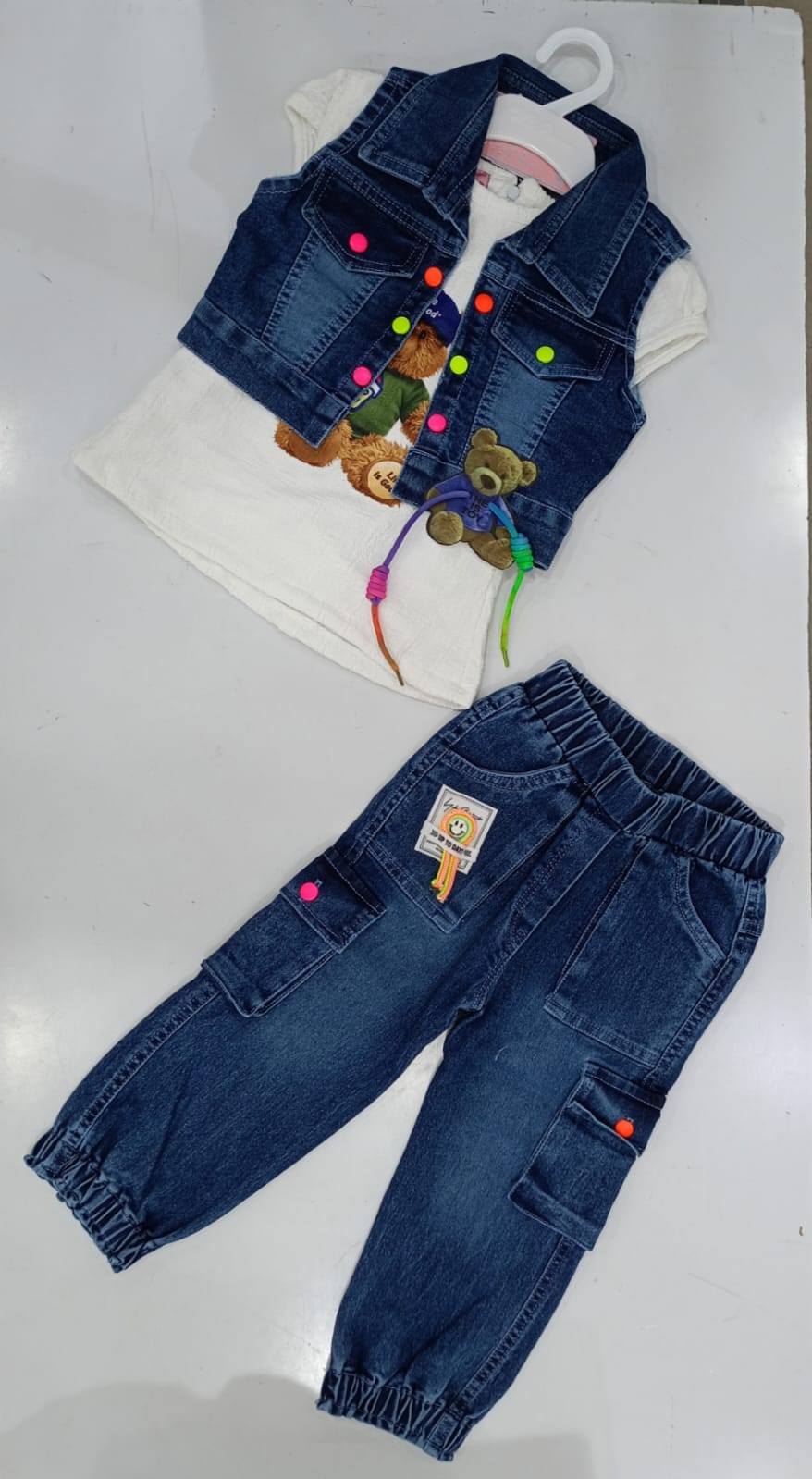 A denim 3-piece look that’s as cheerful as your little one! Features a cute teddy-print tee, colorful buttoned denim vest, and comfy jogger-style jeans. Perfect for all-day play, outings, or photo days. Full marks for style and smiles!