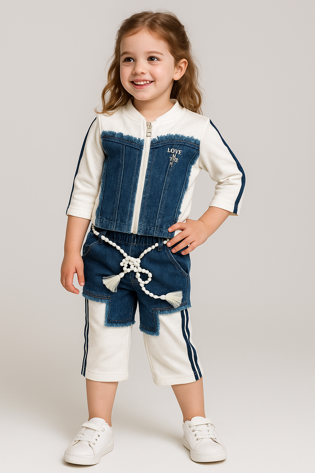Make a bold fashion statement with this unique denim-inspired co-ord set! Featuring a front-zip jacket with raw-edge denim detailing and “LOVE IS THE KEY” embroidery, paired with matching dual-tone cropped pants and a playful pearl tassel belt — this look blends sporty vibes with trendy charm.
