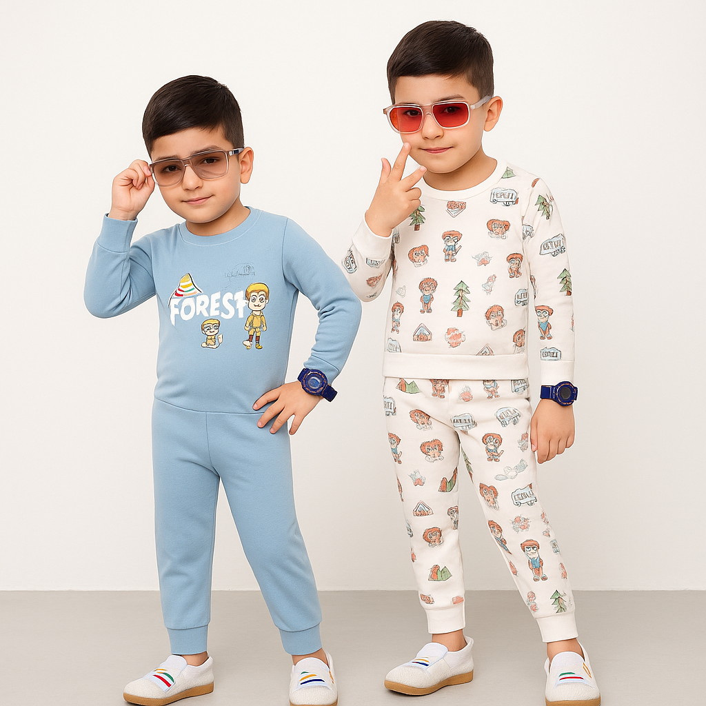Playful and cozy full-sleeve tshirt with matching joggers, featuring adorable forest ranger and puppy prints. Available in pastel blue and off-white — perfect for winter adventures, playdates, and naps. Soft fleece lining for extra comfort!