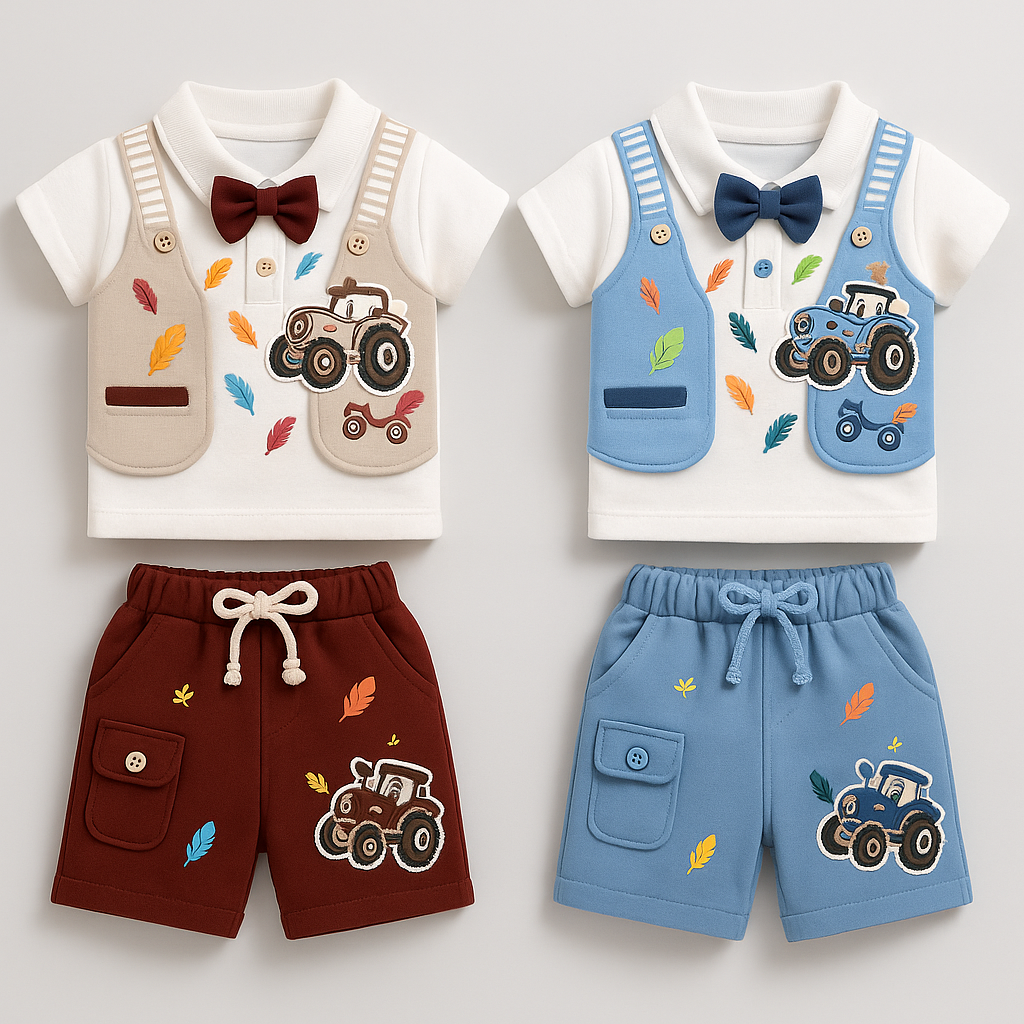 This adorable 2-piece baby boy outfit features a smart cotton shirt with attached striped vest and bow tie, paired with soft shorts. Designed for playful elegance, it’s perfect for parties or gifting. Crafted from 100% cotton interlock for maximum comfort and breathabil