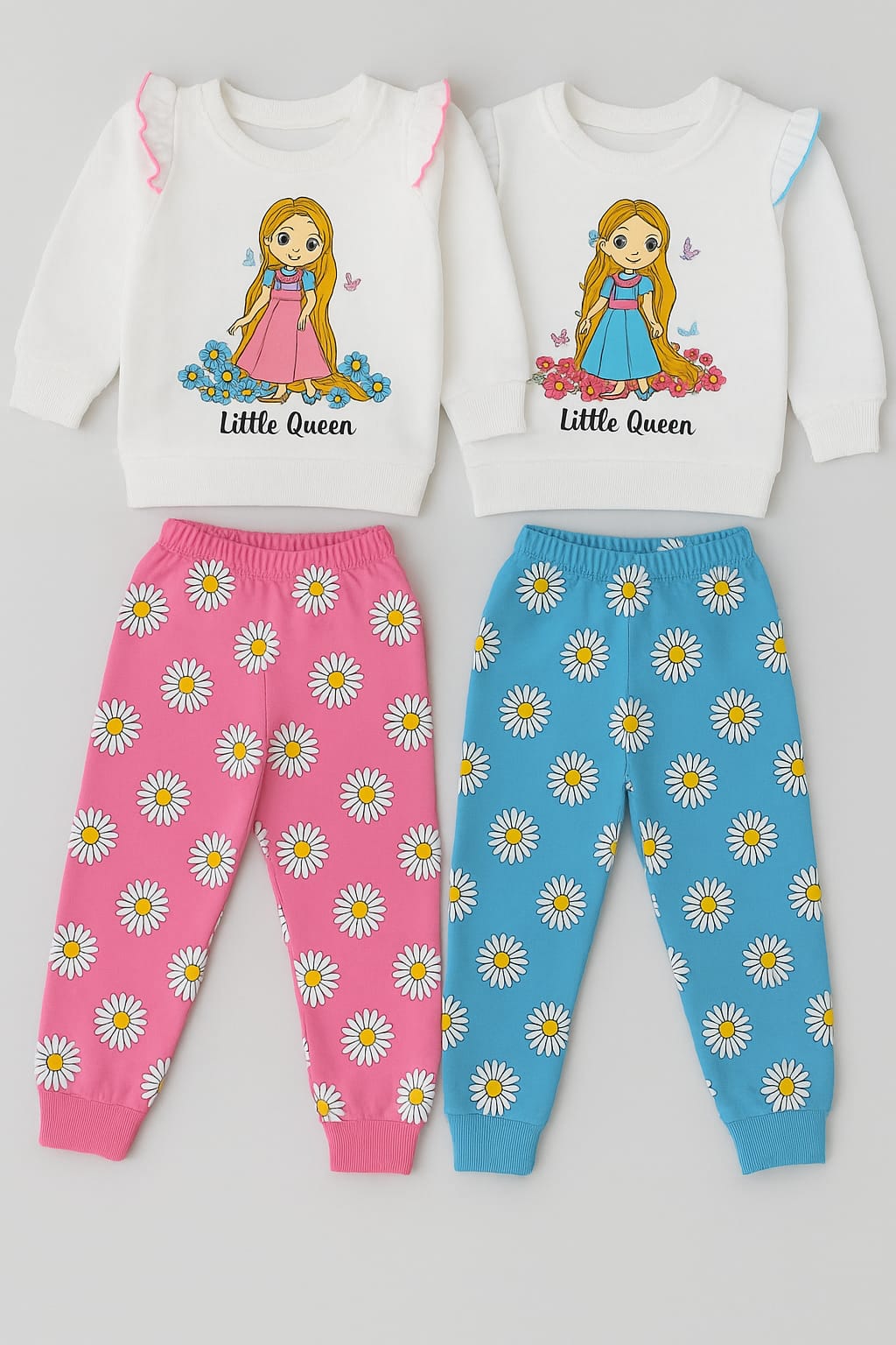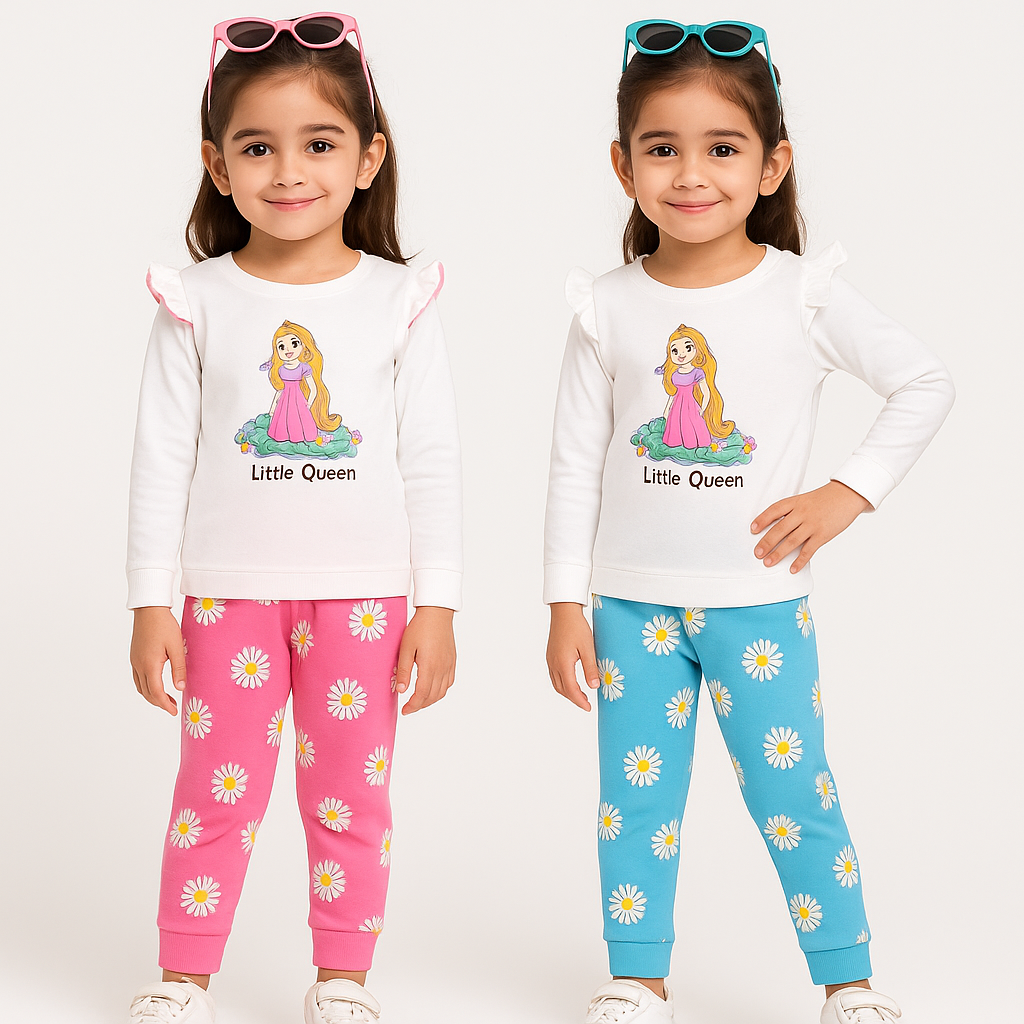 Adorable Comfort combo featuring two cozy full-sleeve t-shirts with “Little Queen” princess prints, paired with floral daisy-print joggers. Comes in vibrant pink and blue variations – perfect for playful comfort and everyday cuteness.