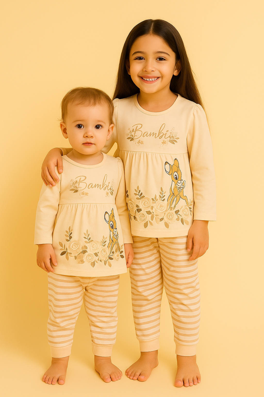 Let your little one bloom in comfort with this adorable two-piece Bambi-themed floral top and striped pant set.