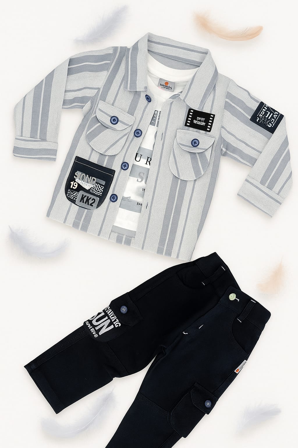 This stylish baby boy outfit features a soft striped button-up shirt with playful patch details, paired with sleek black cargo pants. The urban design, modern twist—perfect for little trendsetters on the move!